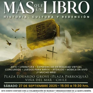 Únete este sábado 27 de septiembre de 15:00 a 19:30 hrs. en la Plaza Eduardo Grove y descubre la riqueza histórica, cultural y espiritual de la Biblia. Disfruta de música en vivo, charlas, muestras de arte, experiencias VR, exposición de biblias históricas, zona infantil, stands de librerías, colegios e institutos bíblicos, y mucho más. ¡Un evento gratuito para toda la familia!