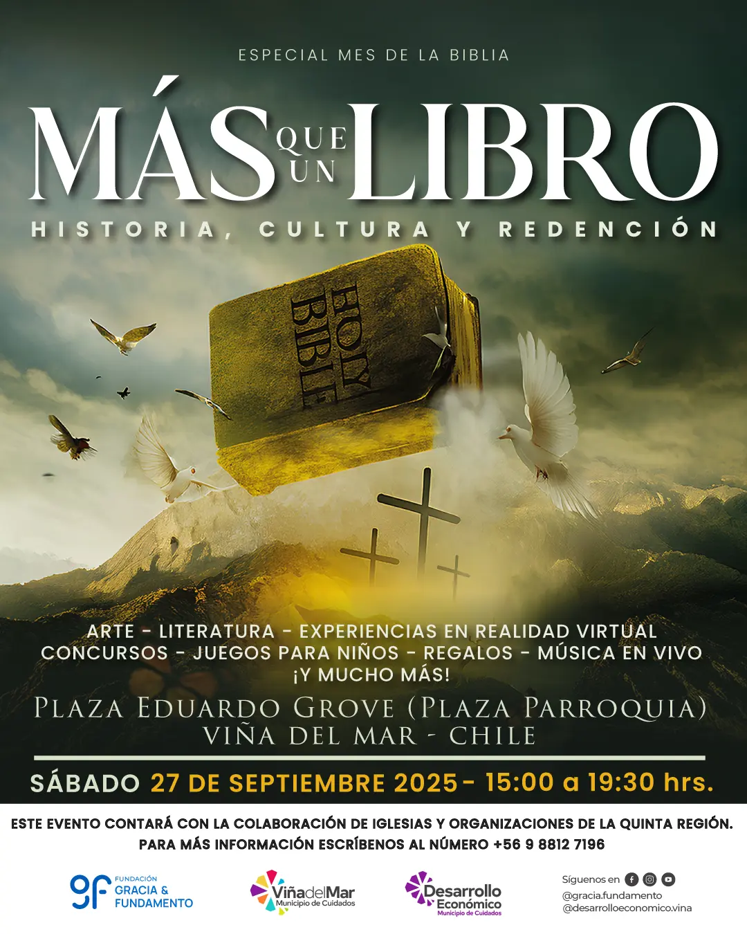 Únete este sábado 27 de septiembre de 15:00 a 19:30 hrs. en la Plaza Eduardo Grove y descubre la riqueza histórica, cultural y espiritual de la Biblia. Disfruta de música en vivo, charlas, muestras de arte, experiencias VR, exposición de biblias históricas, zona infantil, stands de librerías, colegios e institutos bíblicos, y mucho más. ¡Un evento gratuito para toda la familia!